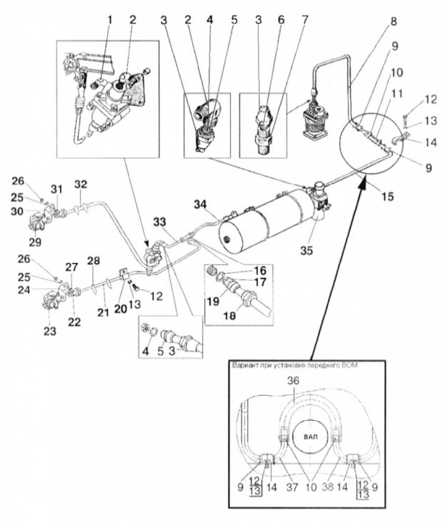 Трубопроводы и арматура двухпроводного пневмопривода тормозов прицепа (3506)